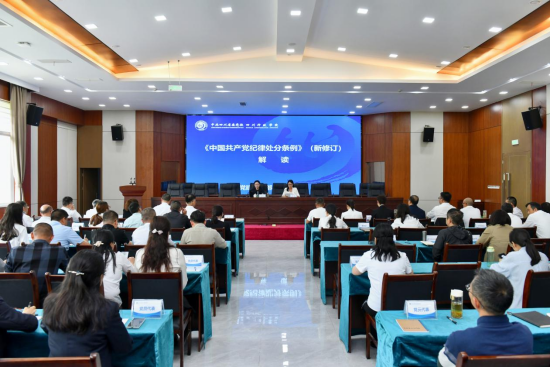 为深入学习贯彻习近平总书记关于开展党纪学习教育的重要讲话和重要指示精神,用遵纪守规营造风清气正的校园政治生态,5月9日,四川省委党校党建教研部禹竹蕊教授受邀为我校党委理论学习中心组学习(扩大)会议作专题培训。党委书记陆健主持讲座,全体领导班子成员、中层干部、各党总支(直属党支部)纪检委员、党员代表参加培训。
